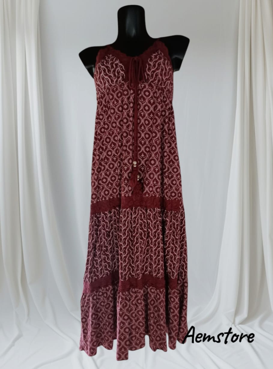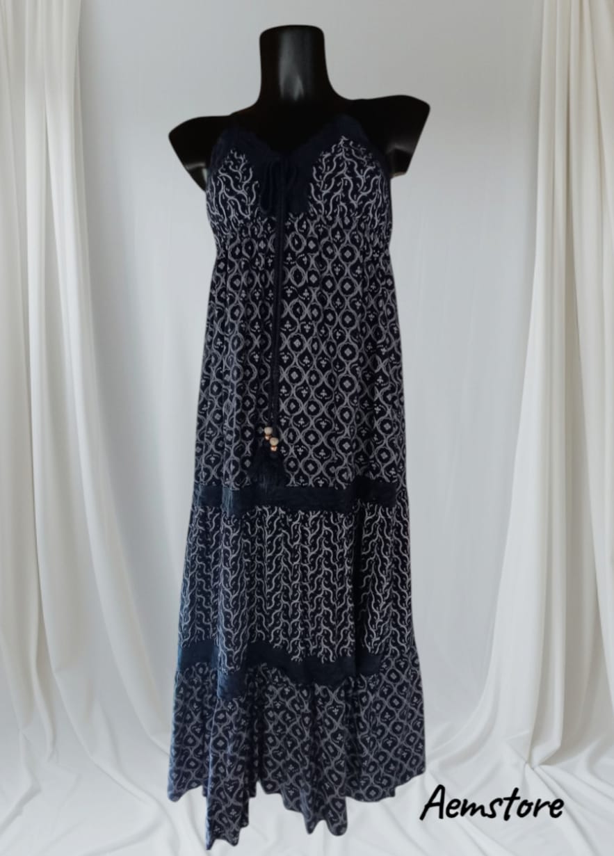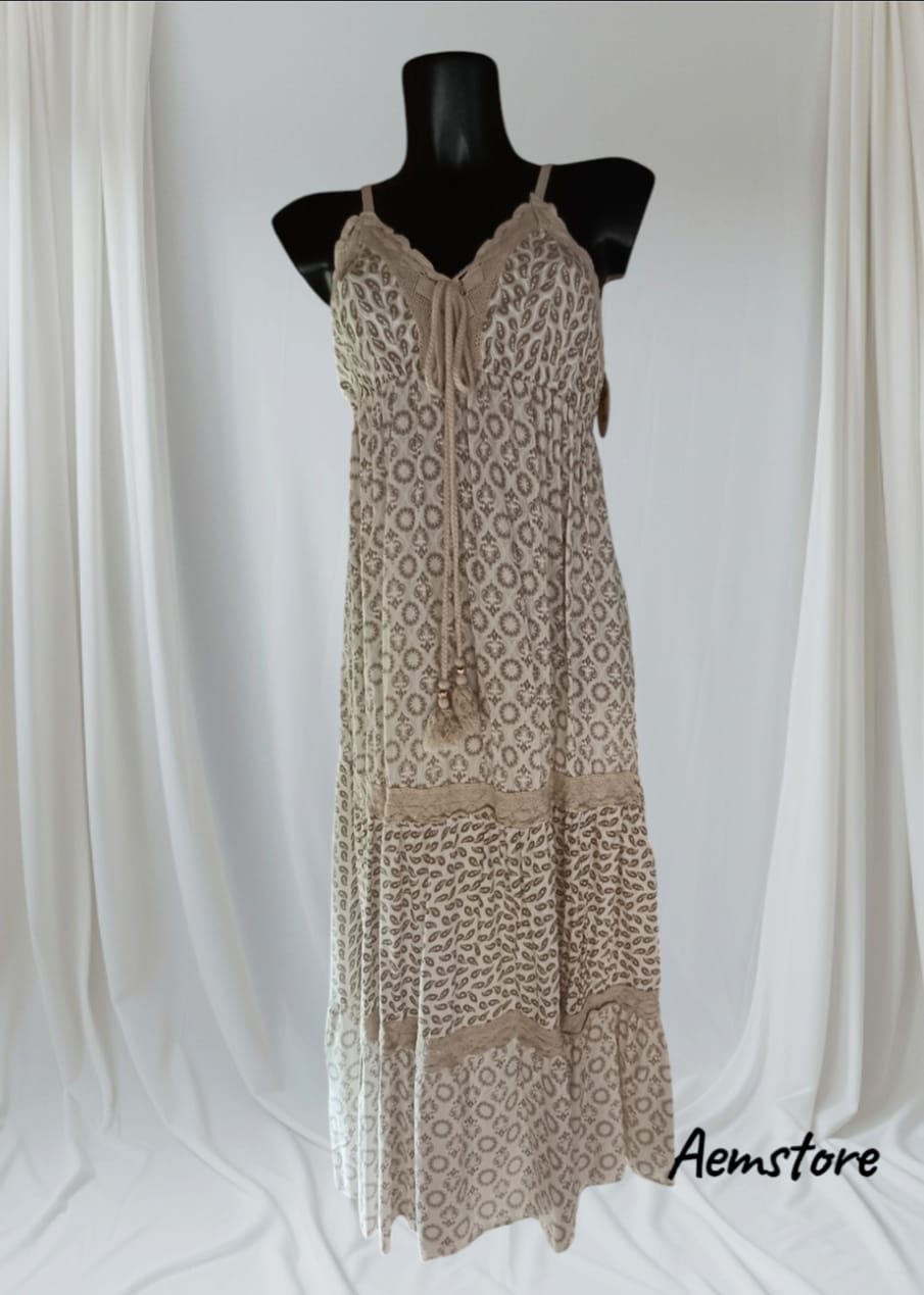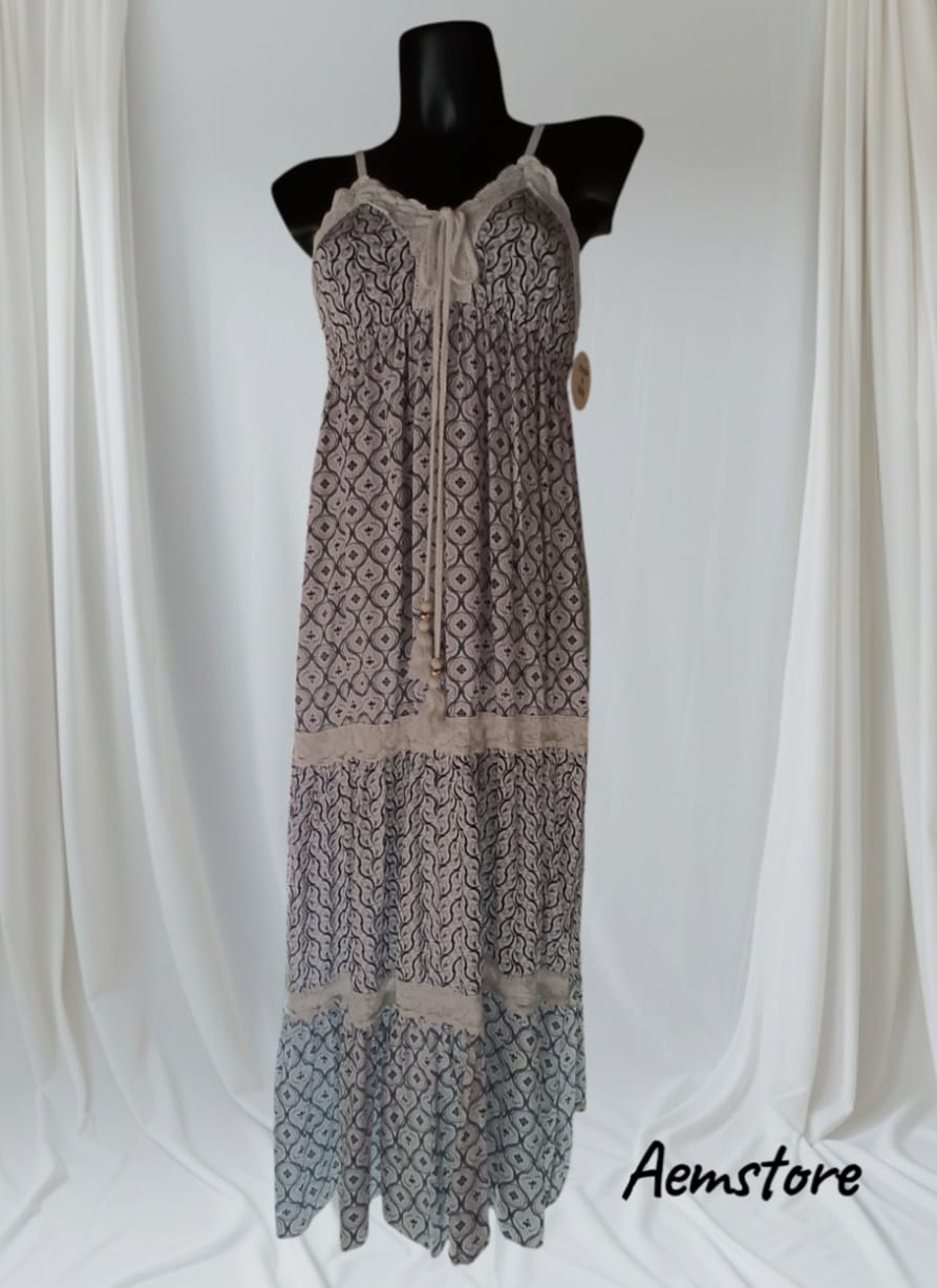 Esalta la tua femminilità con questo abito lungo in 100% viscosa, perfetto per le giornate estive o le vacanze al mare. Il design boho-chic con fantasia geometrica e onde intrecciate regalano un tocco fresco e romantico, mentre la linea morbida e scivolata garantisce comfort e leggerezza.