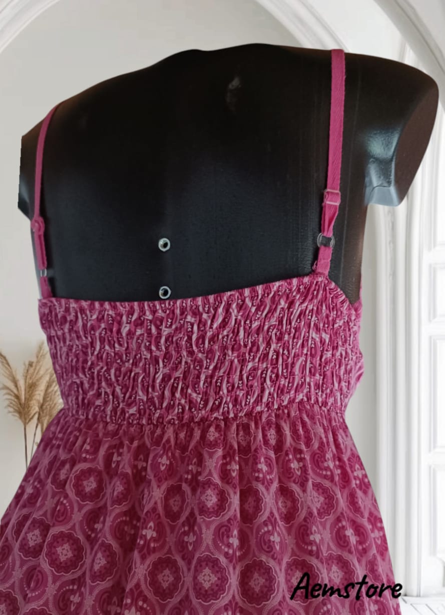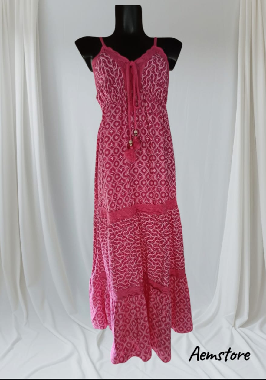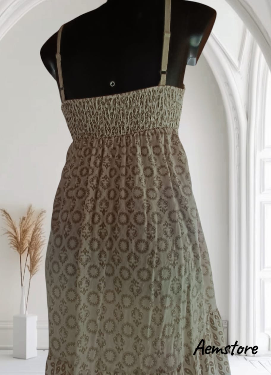 Esalta la tua femminilità con questo abito lungo in 100% viscosa, perfetto per le giornate estive o le vacanze al mare. Il design boho-chic con fantasia geometrica e onde intrecciate regalano un tocco fresco e romantico, mentre la linea morbida e scivolata garantisce comfort e leggerezza.