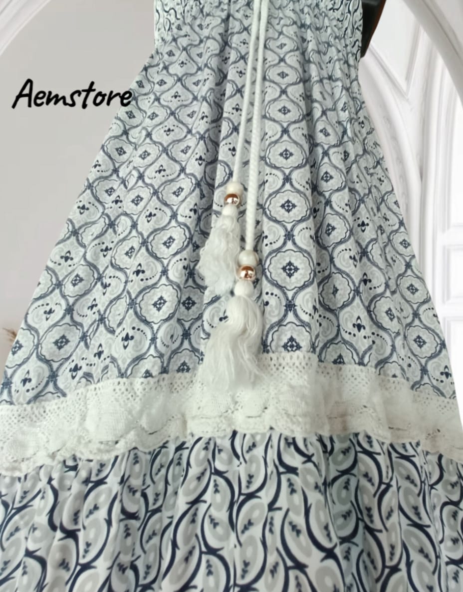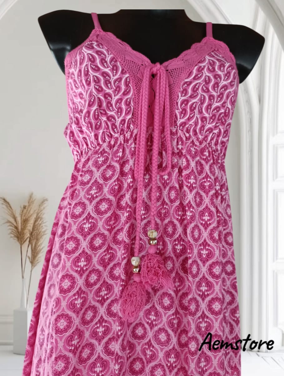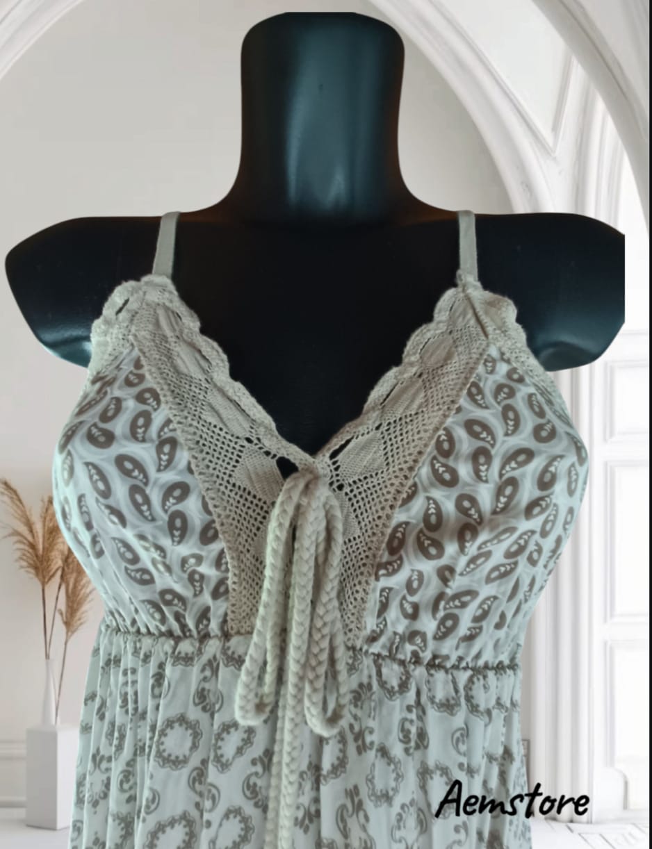Dotato di spalline sottili regolabili, scollo a V con laccetti decorativi e nappine, questo abito unisce praticità e stile. La parte inferiore è arricchita da balze e inserti in pizzo tono su tono, per un effetto dinamico e sofisticato.