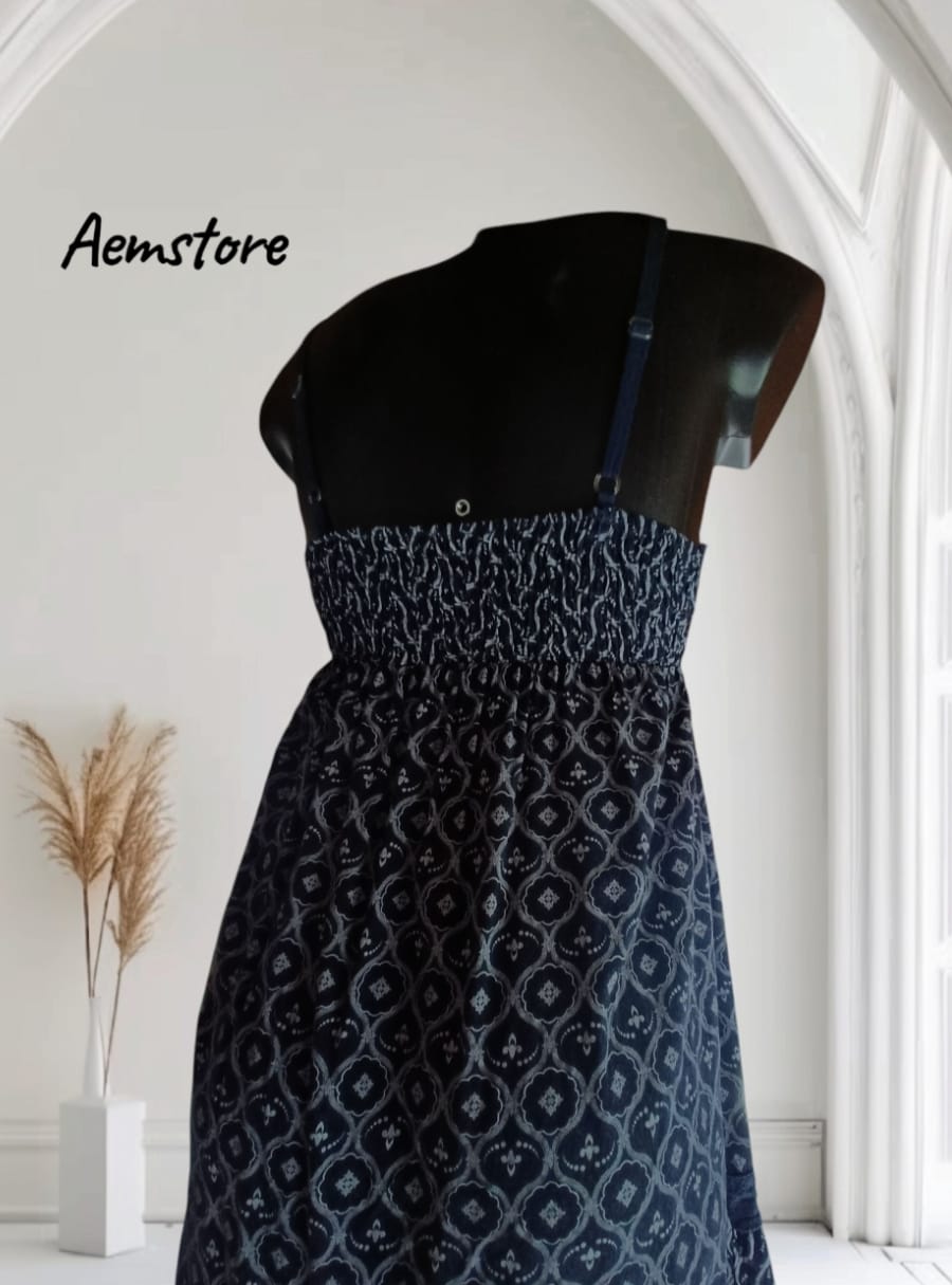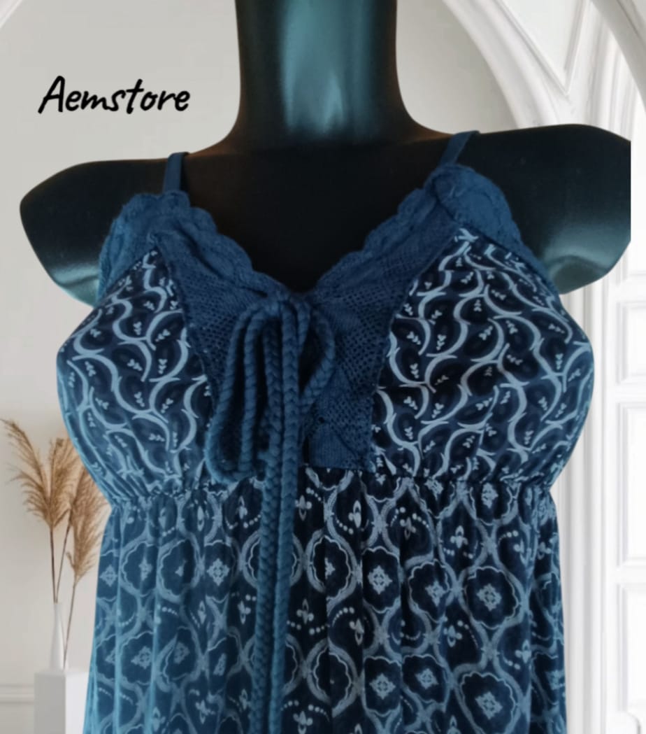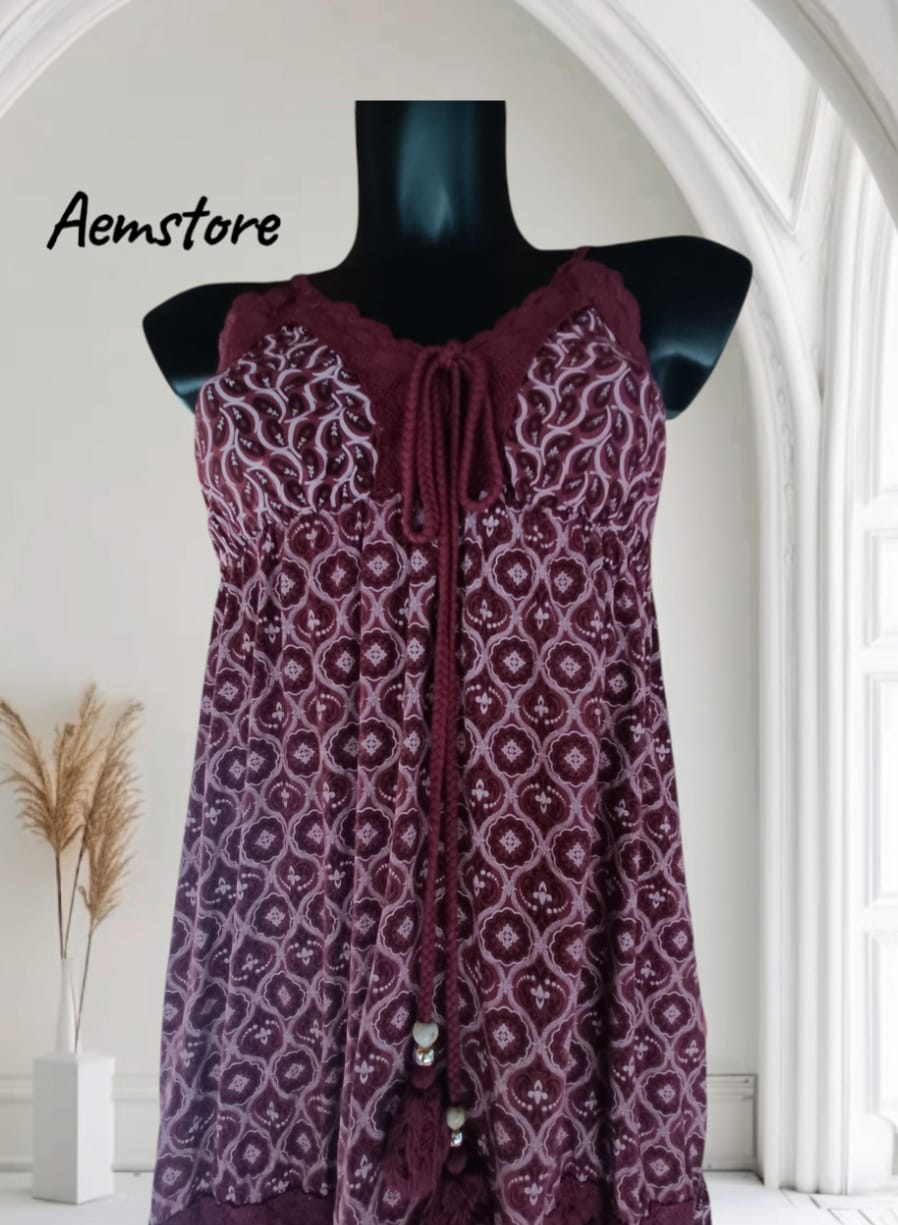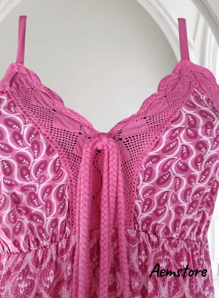 Dotato di spalline sottili regolabili, scollo a V con laccetti decorativi e nappine, questo abito unisce praticità e stile. La parte inferiore è arricchita da balze e inserti in pizzo tono su tono, per un effetto dinamico e sofisticato.
