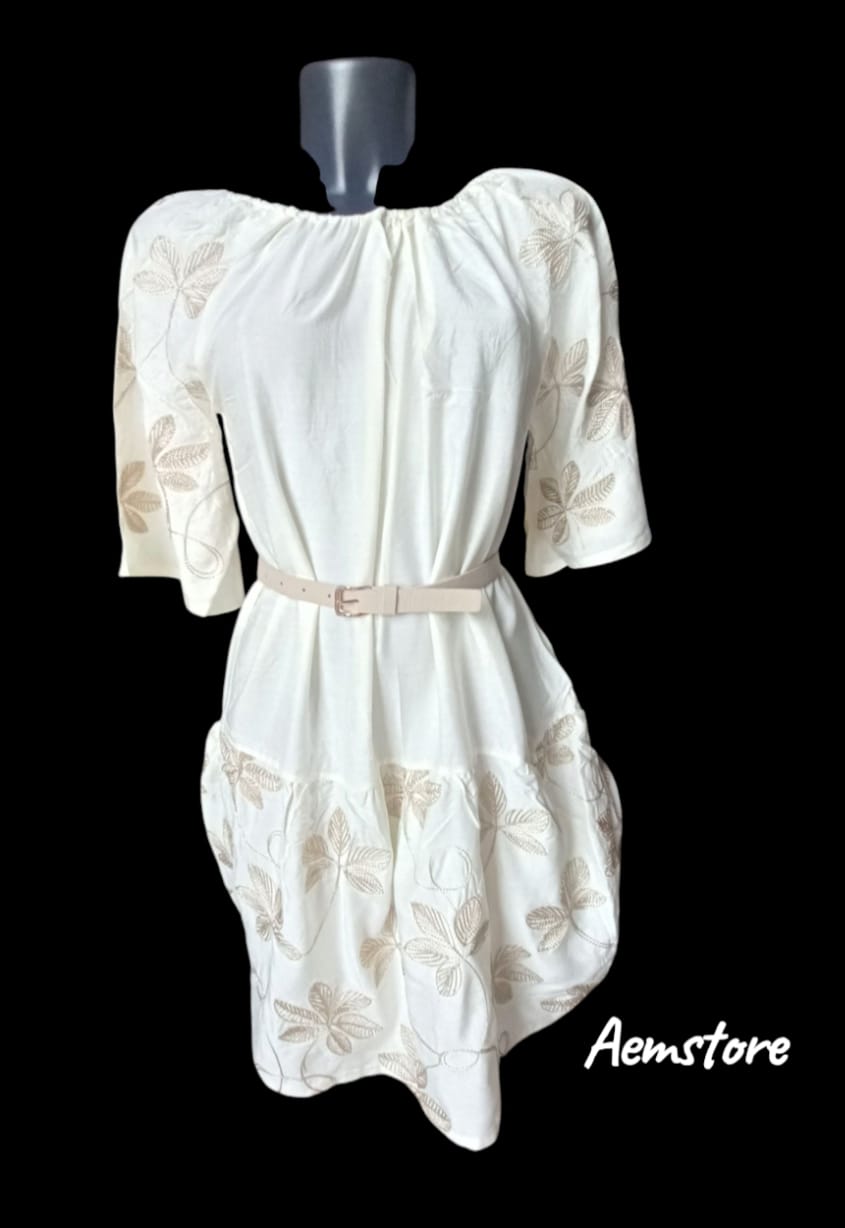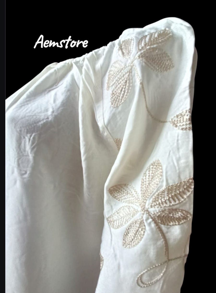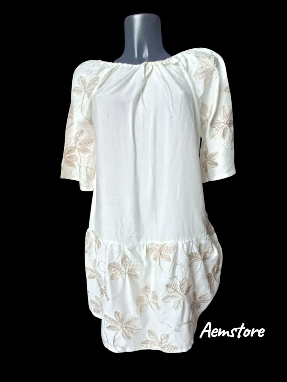 Colore bianco a mezze maniche con fiori ricamati.