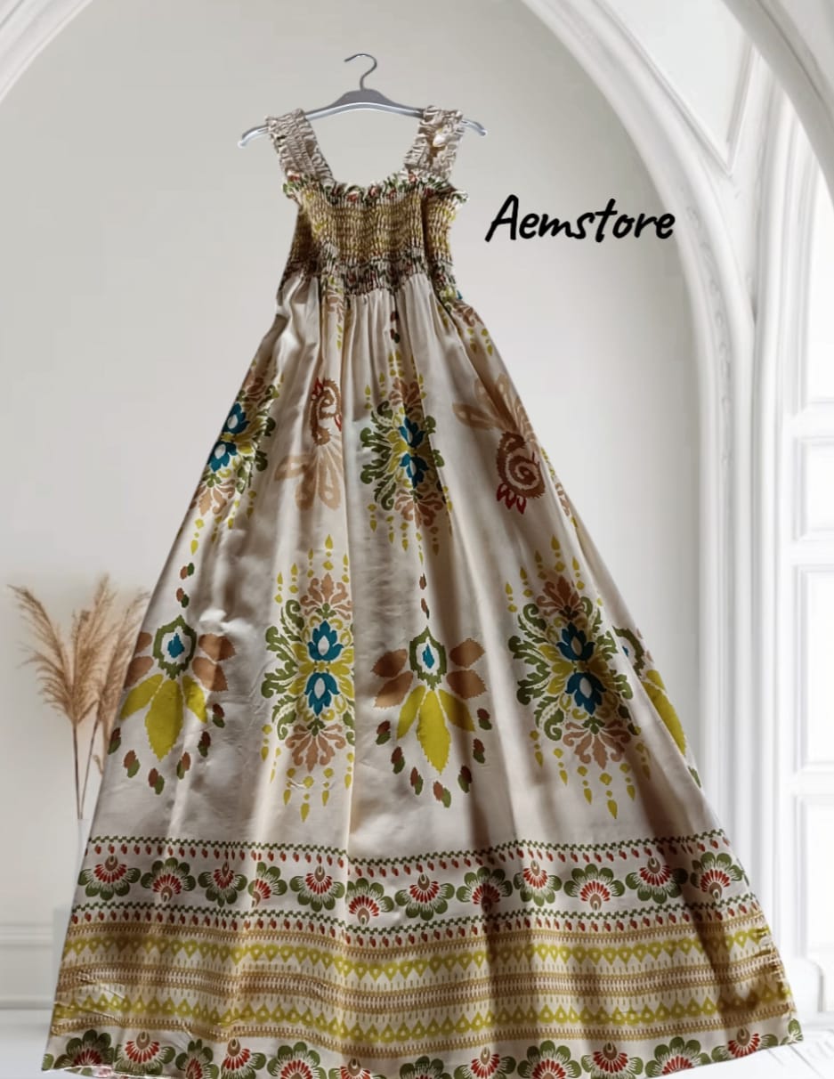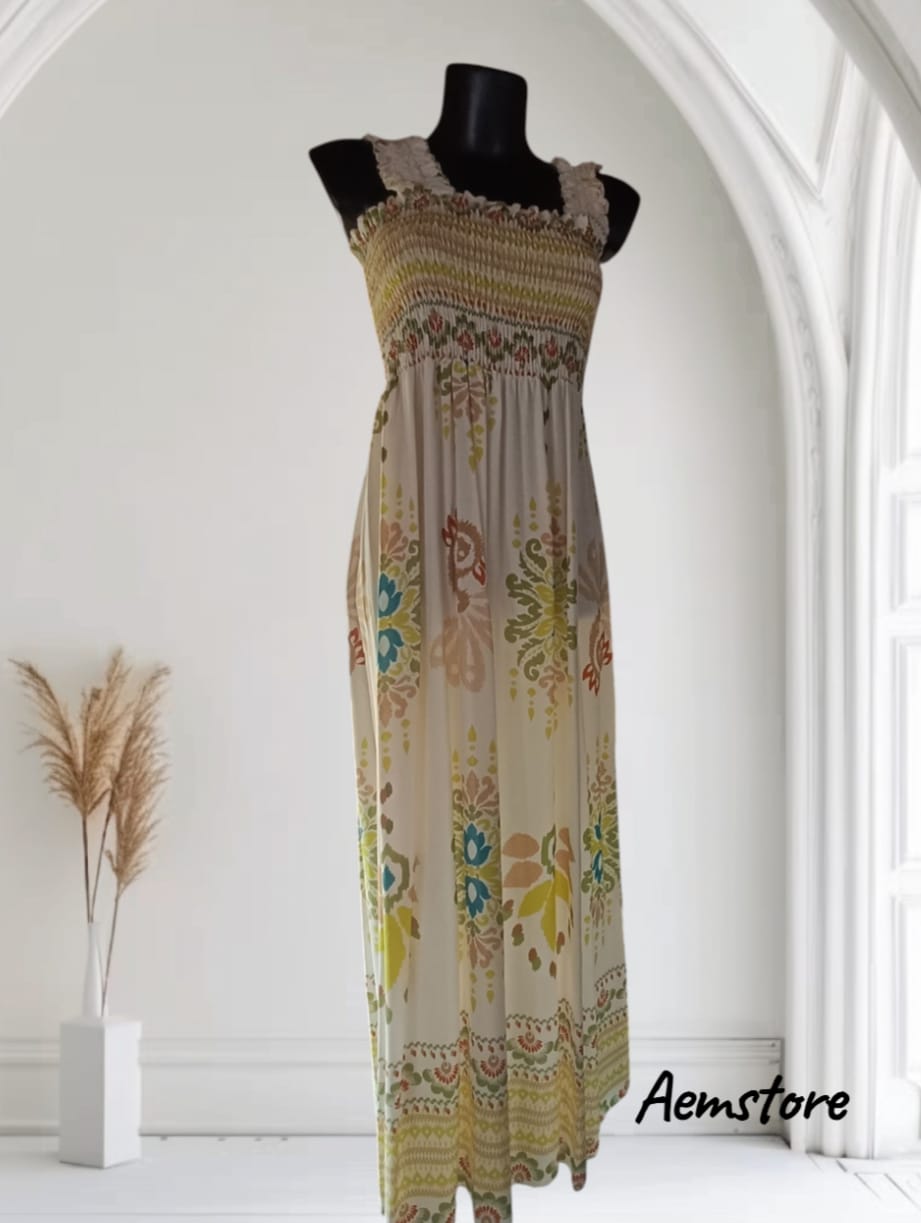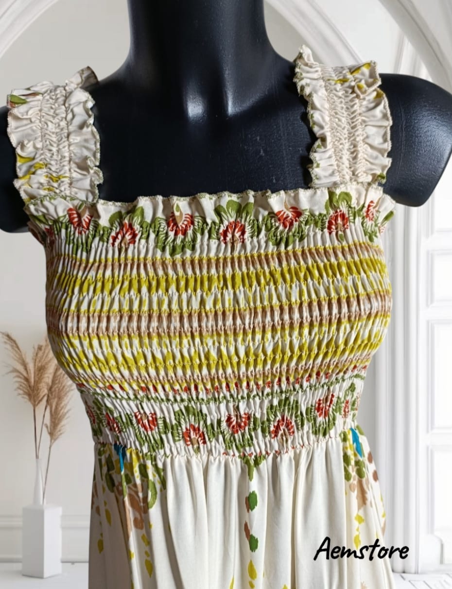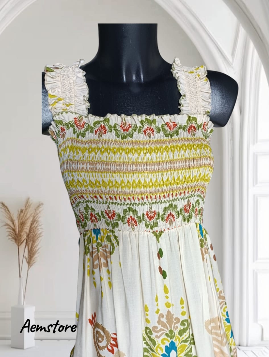 Elegante e leggero, questo abito lungo è realizzato in 100% viscosa, un tessuto morbido e traspirante che garantisce comfort in ogni occasione. Il corpino presenta una lavorazione smock elasticizzata che si adatta perfettamente alla silhouette, mentre le spalline arricciate con volant donano un tocco romantico e femminile.