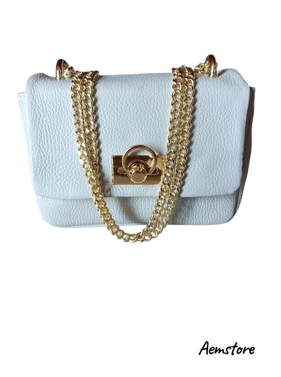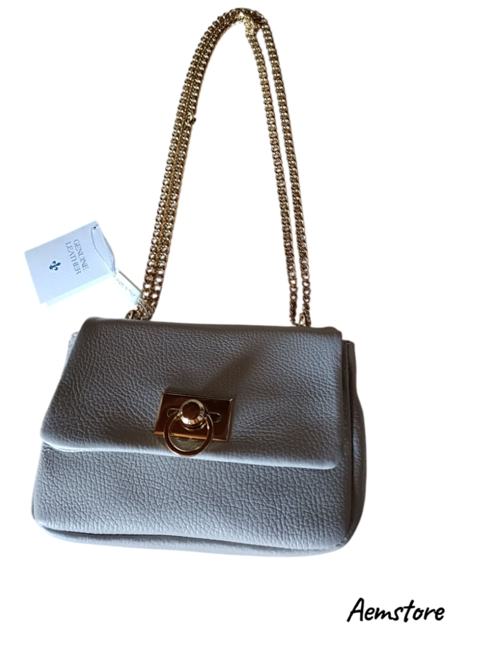 Borsa realizzata in vera pelle di colore grigio con tracolla a catena dorata.