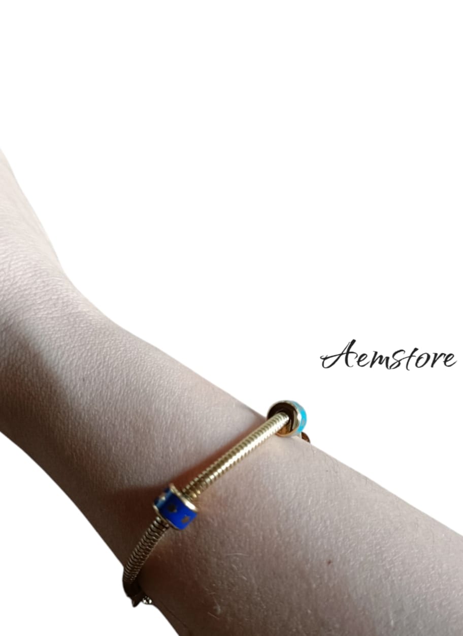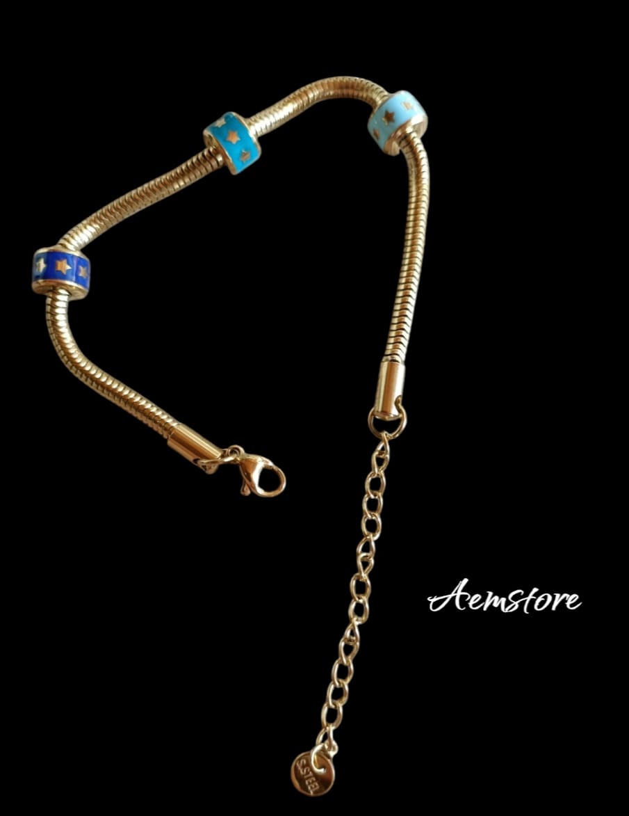 Bracciale in acciaio con 3 ciondoli colorati regolabile su tre lunghezze.